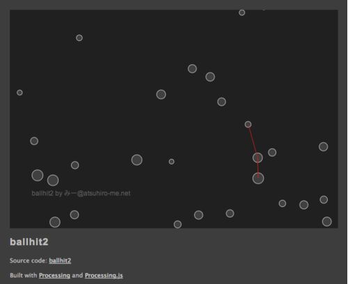 円が衝突して跳ね返るのをシュミレーションします。見て和むためのものです。 こちら ソースコード http://i.atsuhiro-me.net/pc/processing/ballhit/ballhit2.pde 更新履歴 2014.8.6 衝突時の表示をシンプルにした 2013.7.11 processing.jsにバージョンアッ…