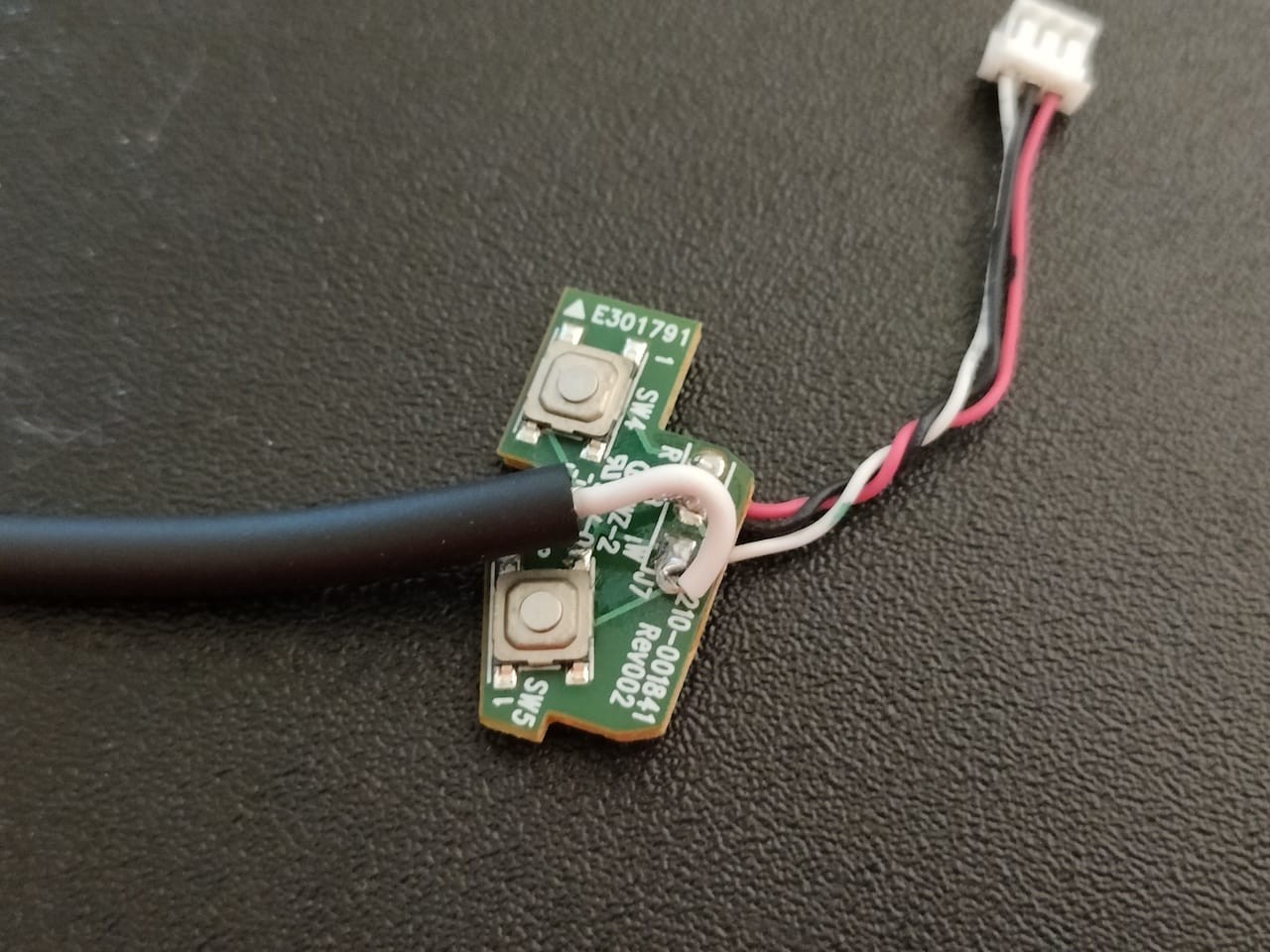 フットペダルをmouse button 5のスイッチに並列で取り付けました.合体させて,配線をきれいにし,マウスのケースをもとに戻しました.