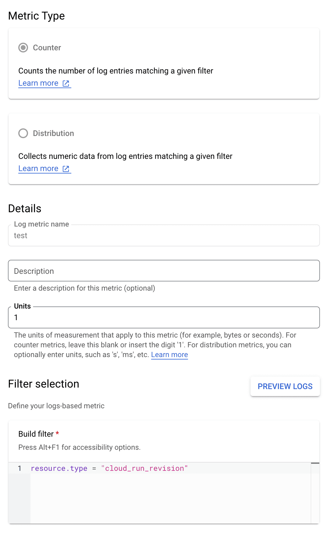 フィルターにresource.type = "cloud_run_revision"と指定し,Cloud Runで生成されたログの数を集計するユーザー定義のログベースの指標を作成しました.