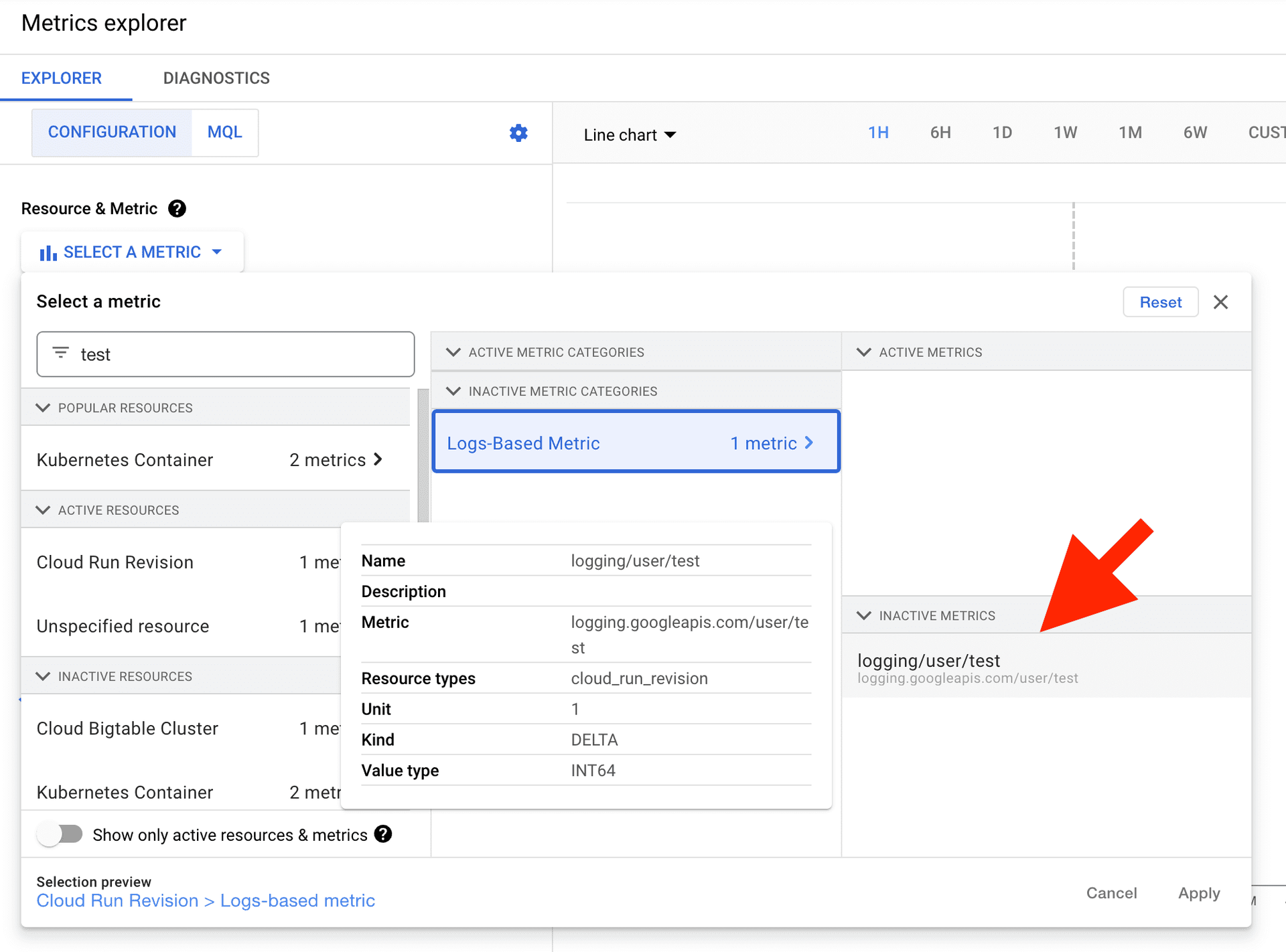 作成直後にMetrics Explorerで指標を選択すると,inactiveとなっています.