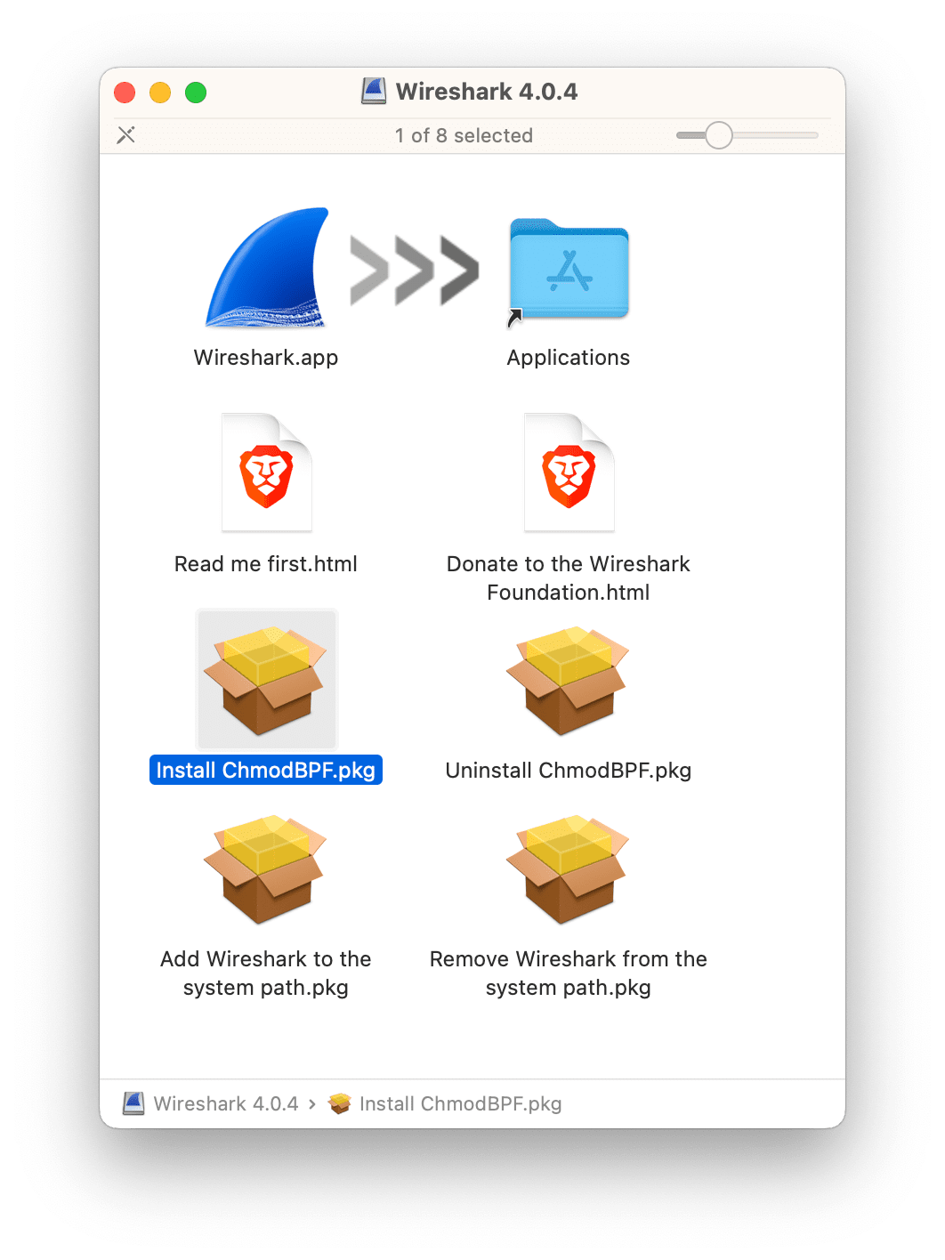 M1 MacOS 用の Wireshark が公開されているのでダウンロードしてインストールします.権限が不足している場合は "Install ChmodBPF.pkg" を実行します.