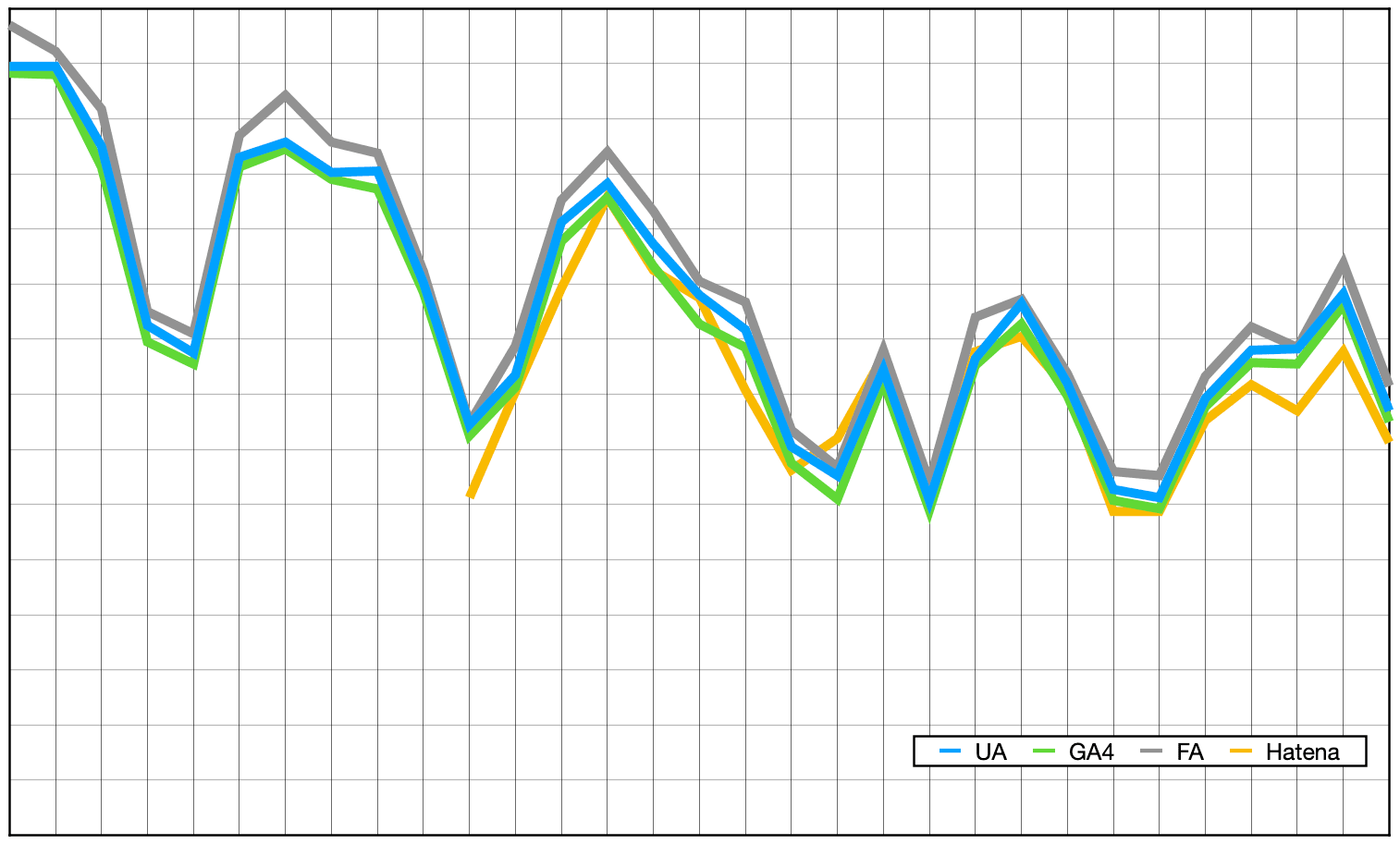 数値を比較すると, FA > UA > GA4 > Hatena アクセス解析 の順に小さくなりました.最大で 15% の差が見られました.ユーザー数の推移は同じような傾向が見られました.