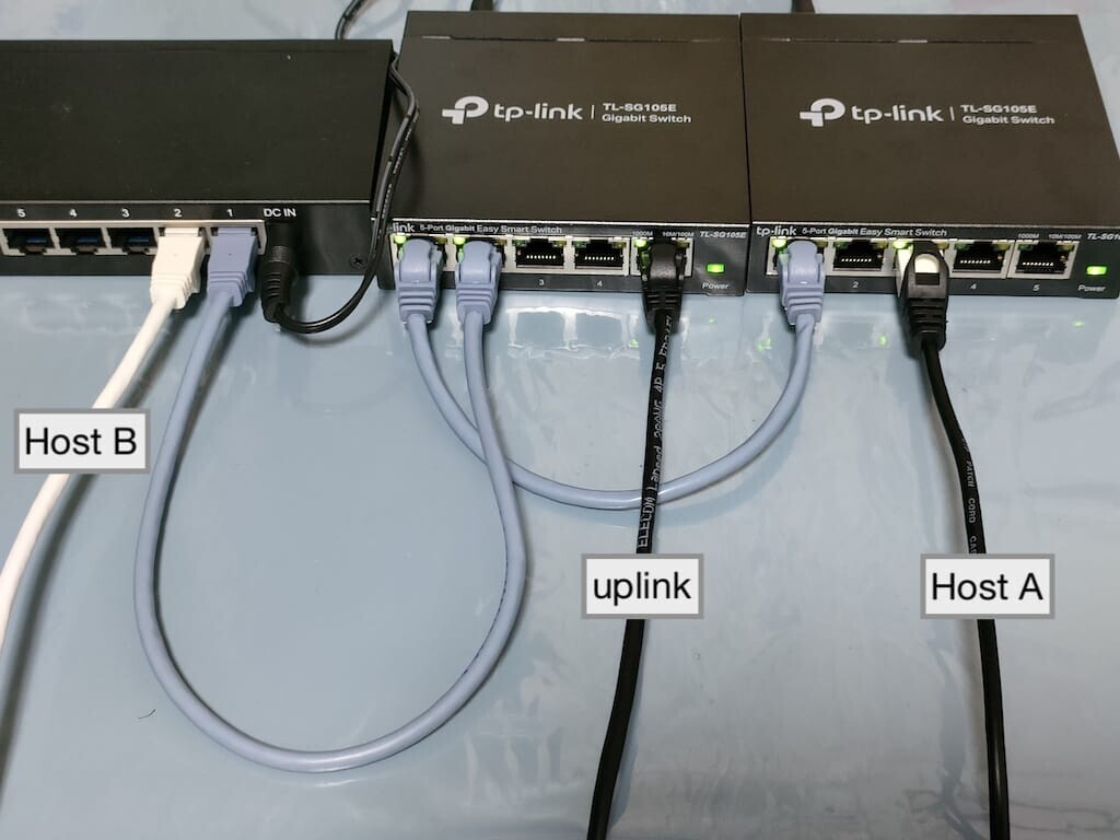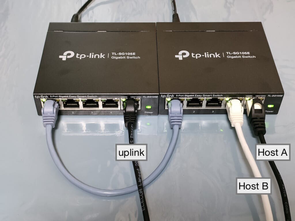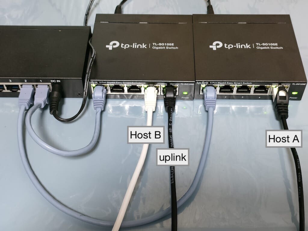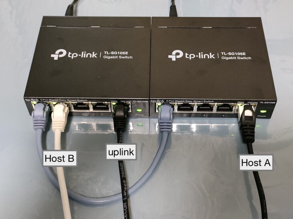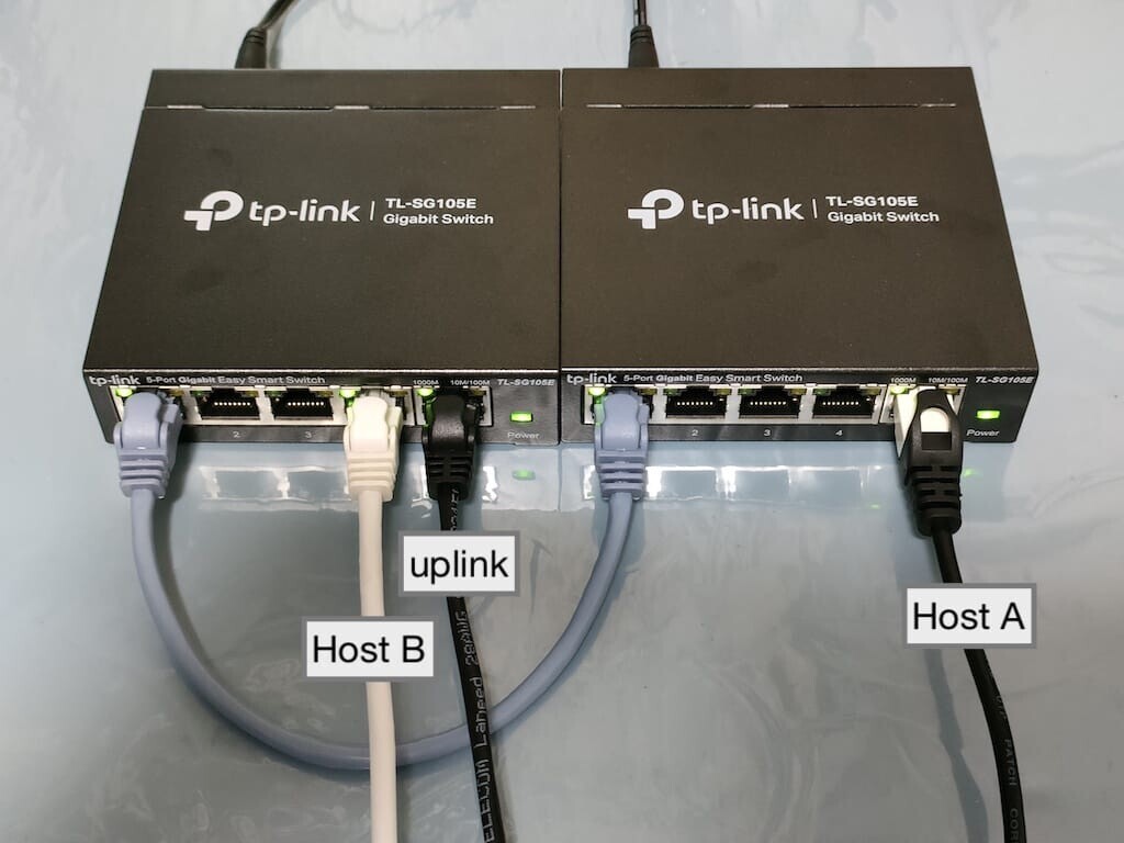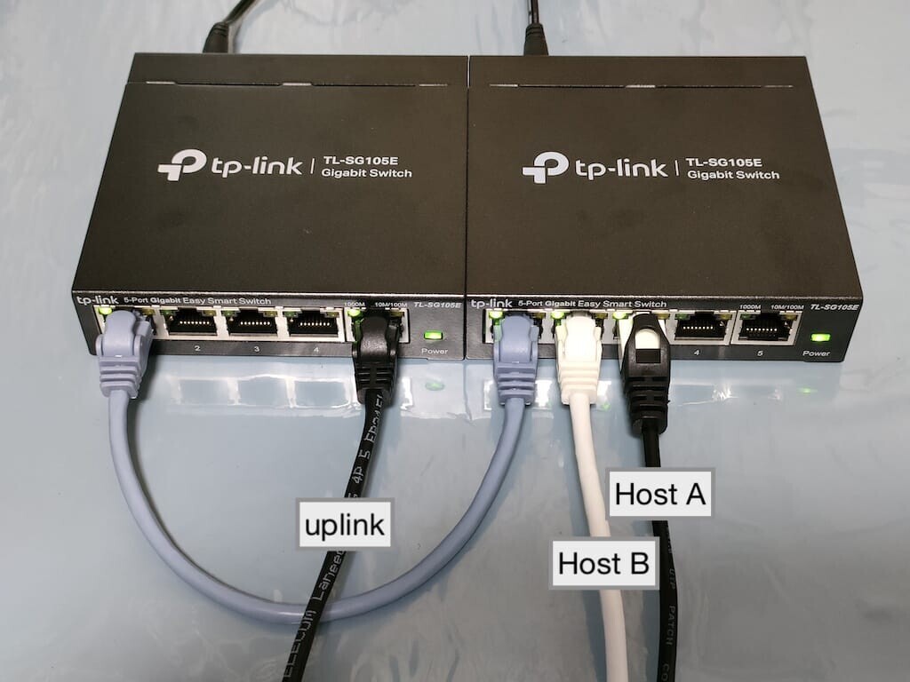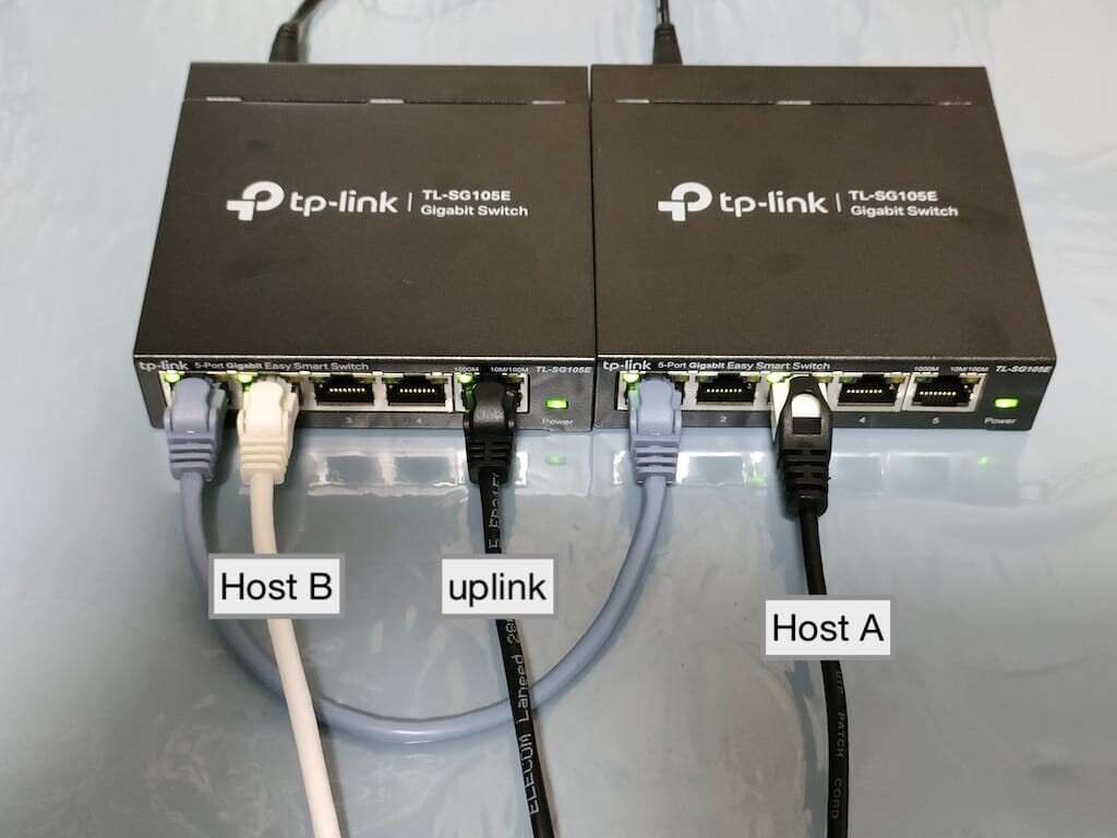 このような設定のスイッチを 2 台用意しました.uplink には,DHCP サーバーを含む機器が接続されています.スイッチの設定はそのままで,接続するポートを変更し,Host A から Host B に対して ping コマンドで通信できるかを調べました.