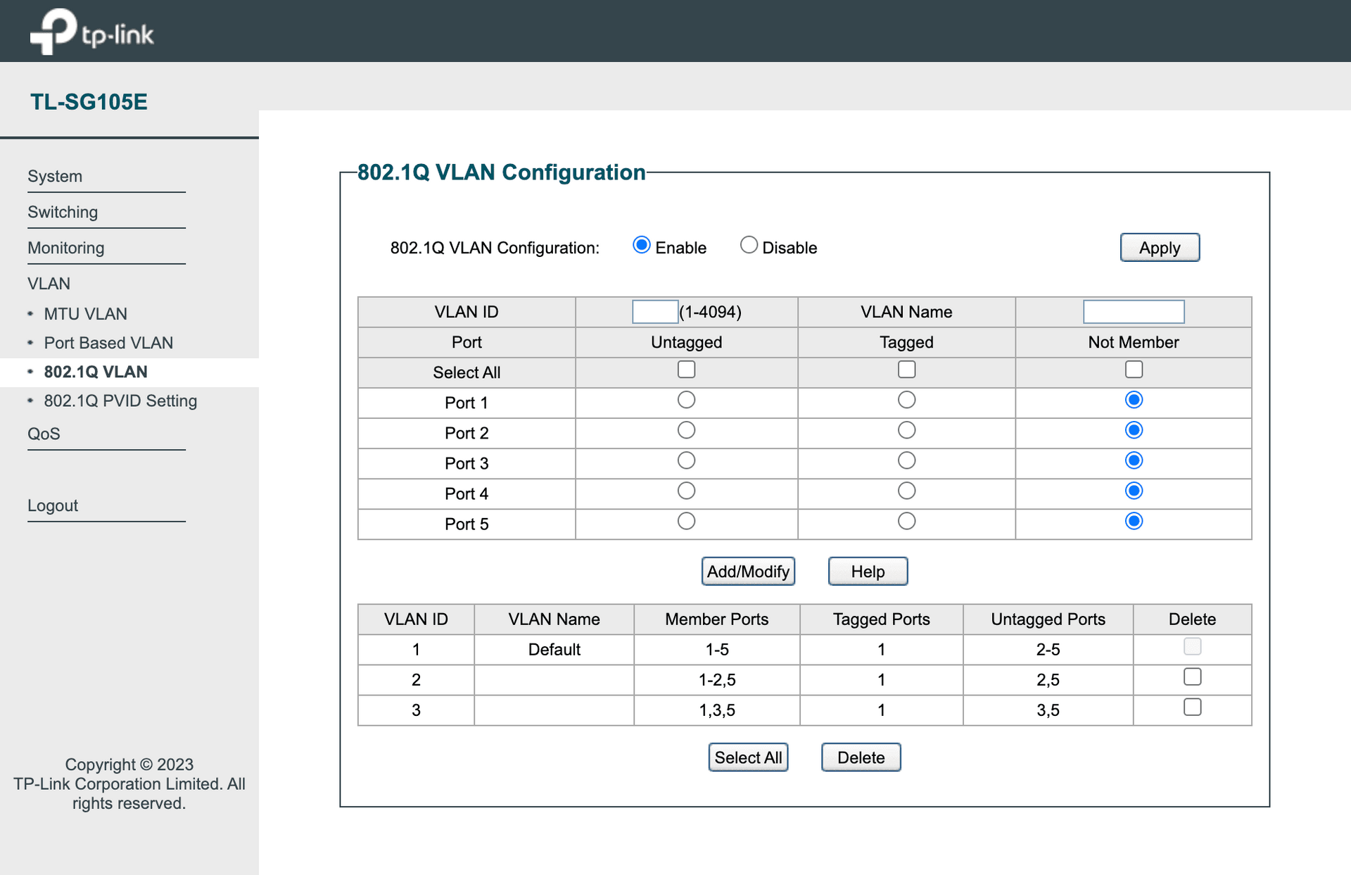 ブラウザーから管理画面にアクセスできるようになっています.Port 1 をタグ対応の VLAN ID 1 に使用し,Port 2, 3 をそれぞれ VLAN ID 2, 3 に使用し, Port 4, 5 をタグ非対応の VLAN ID 1 に使用するように設定しました.